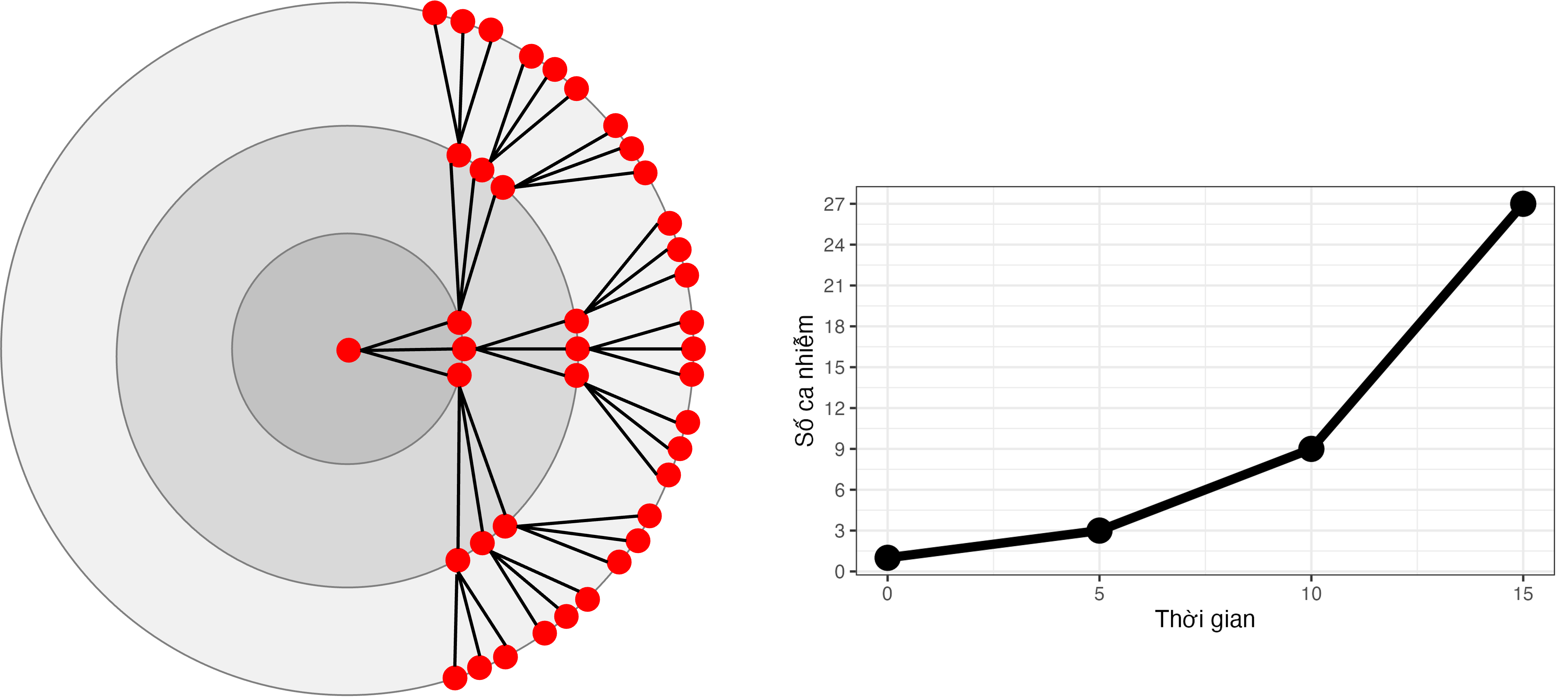 Với \(R\) là hệ số lây nhiễm và \(T_g\) là khoảng thời gian trung bình giữa hai thế hệ lây nhiễm.